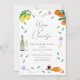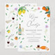 Convite de casamento ou de noivado moderno, colorido e caprichoso em aquarela, com tema de queijo e vinho boêmio, com simples elementos botânicos e tema de citrinos laranja e limão, ideal para um casamento ensolarado de verão ou festa de noivado com tema europeu. A obra de arte original da artista Catherine Sweetman inclui folhagens, flores silvestres, queijo e vinho, notas musicais e taças de vinho espumante borbulhante. Caligrafia caprichosa e tipografia moderna com modelos fáceis de personalizar para adicionar nomes, data e outras informações essenciais, juntamente com as iniciais dos noivos no rótulo da garrafa de vinho espumante ilustrado. A paleta de cores inclui limão, amarelo, laranja, verde, azul, roxo e rosa.