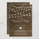 Convite de festa de noivado único e caprichoso com luz branca de cordas sobre fundo de madeira falsa. Este convite de festa de noivado totalmente personalizável é perfeito para os eventos temáticos do rusticidade do país, outono e chique.