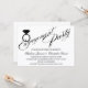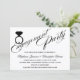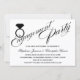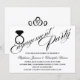 © Designs socialitas. Nosso belo roteiro/texto de festa de noivado de caligrafia, com texto preto sobre fundo branco, e design de anel de diamante adicionam um toque de simples elegância a este convite de festa de noivado. Substitua facilmente o texto do nosso modelo com as suas informações de eventos especiais. O anel de diamante pode ser redimensionado, movido ou excluído para se adequar a você.