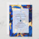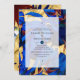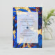 Convite festa de noivado com um padrão de selva em tons de azul, burgundy e ouro.