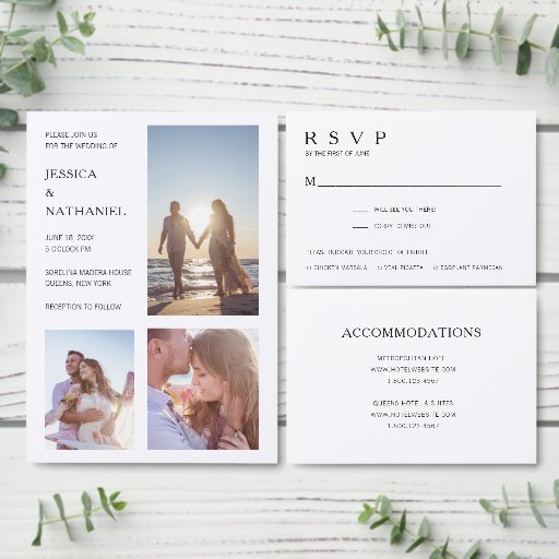 Convite moderno para festas de noivado em preto e branco com uma colagem de fotos com três de suas fotos favoritas. Os detalhes do evento estão à esquerda no estilo minimalista. Este convite para festas de noivado é excelente para um casal que quer mostrar várias de suas fotos favoritas.