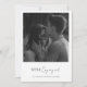 Convite moderno de festa de noivado com um simples design minimalista em preto e branco clássico. Abaixo, sua foto é "Estamos engajados" com a palavra "engajados" em uma tipografia elegante de roteiro. O verso tem uma segunda imagem junto com os detalhes do seu evento.