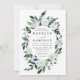 Designs apresentam elegantes elementos florais de aquarela em tons de azul empoeirado, aço, névoa e mais sobre uma coroa pintada de verde. A parte traseira apresenta uma sombra azul clara correspondente. A parte de trás também apresenta uma buquê de flores e eucalipto correspondentes. Visualize a coleção nesta página para localizar itens correspondentes nesta design.