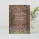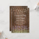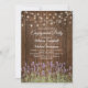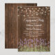 Convites de festa de noivado no jardim com fundo de madeira de celeiro, flores de lavanda roxa de verão, luzes cintilantes e um modelo de festa de noivado. Clique no botão “Personalizar” para personalização adicional deste modelo. Você poderá modificar todo o texto, incluindo o estilo, as cores e os tamanhos.