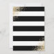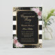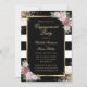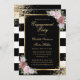 Convite de festa de noivado branco e preto elegante com listras brancas, com flores cor-de-rosa escamoteadas, definindo os detalhes do evento como dentro de um quadro dourado adornado com confete dourado. Itens correspondentes disponíveis. Lave o convite para festas de noivado florais. Convite para festas de noivado em preto e ouro.