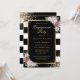 Convite de festa de noivado branco e preto elegante com listras brancas, com flores cor-de-rosa escamoteadas, definindo os detalhes do evento como dentro de um quadro dourado adornado com confete dourado. Itens correspondentes disponíveis. Lave o convite para festas de noivado florais. Convite para festas de noivado em preto e ouro.