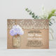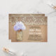 Convite para festas de noivado rústica, bonito, com jarro de mason com flor de hydrangea azul-clara. Convidado perfeito para festas de noivado de campo com local de colheita e sotaques de madeira em apuros.