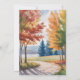 Uma pintura em aquarela de uma paisagem de outono com um caminho de terra sinuoso através de árvores coloridas. As árvores à esquerda têm folhas vermelhas e laranja profundas, enquanto as árvores à direita transitam do amarelo para o verde. Uma árvore de pinheiro azul alta está no meio do plano de fundo. O caminho é pintado em tons marrons quentes com folhas laranja caídas espalhadas ao longo dele. O fundo apresenta colinas onduladas em tons azuis e roxos suaves. O céu é pintado em lavagens suaves de azul e branco, criando uma atmosfera pacífica de outono. A grama ao longo do caminho é representada em vários tons de verde e dourado. A pintura tem um estilo solto e expressivo típico das técnicas de aquarela, com pinceladas visíveis e sangramento de cor. A composição é equilibrada com as árvores criando linhas diagonais fortes que levam do primeiro plano ao fundo. A paleta de cores geral consiste em vermelhos, laranjas, amarelos, verdes, az
