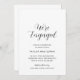 Convites de festa de noivado preto e branco contemporâneos com um layout simples e minimalista com "Estamos envolvidos" em um roteiro elegante de caligrafia. Um design moderno que vai bem com qualquer estilo de festa de noivado.