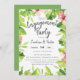 Um convite de festa de noivado cômica com aquarela, uma variedade de folhas de palma, bananeiras e outros elementos tropicais. Este convite personalizável é perfeito para eventos de verão ou primavera.