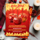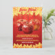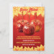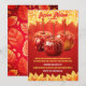 Um convite lindo com três deliciosas maçãs caramelizadas em um fundo vermelho e folhas de outono. Muito bonito para uma festa de outono ou Halloween.