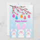 © Designs socialitas. Celebrar a Páscoa com os ovos coloridos de Páscoa, cereja florescente e o convite de fundo. A parte de trás do convite tem três coelhos bonitinhos. Convite perfeito para uma Páscoa, caçada de ovos ou janto de Páscoas.