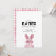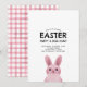 Convite de celebração de Páscoa infantil com coelho rosa com óculos. VOCÊ PODE REMOVER OS ÓCULOS! Fundo com padrão xadrez.