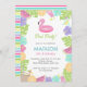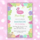 Folhetos tropicais e flores, com frutas e um flamingo fofo flutuante para a festa perfeita de piscina das meninas!