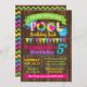 Piscina aniversário de convite, cor-de-rosa quente, roxo, lacrimejo, amarelo e limão, com um fundo de madeira falso adequado para qualquer idade. Adicione seu próprio texto ao modelo, para mais personalização (cor da fonte, estilo da fonte, plano de fundo), clique em personalizar, role para baixo e clique no link "clique para personalizar ainda mais":