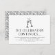 Mantenha a festa rolando! Convites de festa de pós-casamento em tamanho pequeno em preto e branco sofisticados apresentam "a celebração continua" em tipografia preta com os detalhes da sua festa abaixo, encimados por duas taças de champanhe ilustradas unidas por um coração. O verso dos cartões apresenta um padrão de videira e broto botânico em preto e branco combinando.