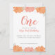 Bonito e chique, este Convite de festas de primeiro aniversario de Pêssego Suave e Pastel Laranja é perfeito para o primeiro aniversário da sua menina. Possui pêssego macio e flores laranja, verde macio e cinzas. Toda a tipografia pode ser alterada para ajustado das necessidades de planejamento do seu partido.