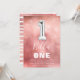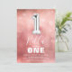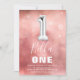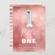Primeiro convite de aniversário moderno projetado com um fundo cor-de-água rosa, confete de bolha transparente, e um grande balão de hélio número um. O nome da criança está escrito em texto branco em grande caligrafia com um simples modelo de aniversário por baixo que é fácil de personalizar.