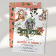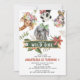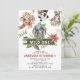 Convite de festas de primeiro aniversario com tema "Bela Selvagem", com os mais adoráveis animais da selva de aquarelas (girafa, elefante. zebra e panda), folhagem tropical com flores exóticas e um modelo de aniversário moderno, fácil de personalizar.