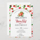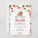 Festa de primeiro aniversario de Morango | Berry First Invitation Cartão de convite de festas para primeiro aniversario para menina em forma de água, com ilustração a cores de morangos. O texto diz "Junte-se a nós para comemorar a primeira festa de aniversário de morango de XX". O verso do cartão de convite também é decorado com o tema de morango.