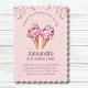 Celebre o dia especial da sua menina com este maravilhoso e personalizado Convite para primeiros aniversarios de Sorvetes. Estes convites encantadores apresentam um fundo cor-de-rosa pastel adornado com aspersores cor-de-rosa, acrescentando um toque de brilho à primeira festa de aniversário da menina. Cada convite apresenta amostras de sorvetes deliciosos em espirais de cor-de-rosa, branca e lilás, revestidas de cerejas avermelhadas e roxas. Cones de wafer aguentam as guloseimas. Perfeito para uma celebração de primeiro aniversario sorvete, eles estão certos de dar o tom de um toque de doçura para o dia memorável da sua menina.