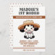 Convite de festas branco e primeiro aniversario castanho com uma vaca fofa vestindo uma vaqueira / chapéu de vaqueiro. Excelente para qualquer um dos anos. Personalize-o com os detalhes do evento.