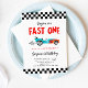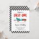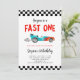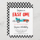 Carteira de convite de festas de criança com tema de corrida, com primeiro aniversario de criança, com ilustração de um carro vintage azul com chamas. O texto diz "XX é um FAST ONE".