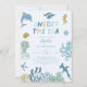 Cartão de convite de festas de menino bonito com ilustração de criaturas marinhas e recifes de corais. O texto diz "Coneder the Sea".