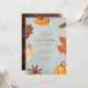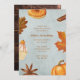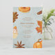 Convites de festas de primeiro aniversario de outono para bebê com ilustração simples das folhas do outono, abóbora laranja, cupcake, rosquinha e especiarias, como palito de canela ou anis, sobre fundo texturizado azul. A parte de trás apresenta a imagem da textura ruótica de madeira. Personalize facilmente com os detalhes da sua festa, cores e fontes favoritas.