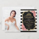 Quinceanera convite de festas com sua foto. Possui listras brancas pretas, fonte de script, rosas cor-de-rosa pastel, tiara e confetti. Design cor-de-rosa branca e preto clássico, com ouro brilhante falso. Perfeito para uma celebração elegante.