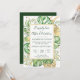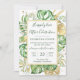 Este convite de recepção de casamento tropical elegante apresenta folhas de palmeira, filodendro e samambaia em verde e dourado. Uma moldura dourada elegante destaca o texto em verde escuro. Salpicos dourados acentuam este design botânico exótico e trazem um toque de capricho moderno ao convite. "Celebração Feliz para Sempre" junto com os nomes da noiva e do noivo são apresentados no topo. Os detalhes dos votos de casamento e a localização e data da recepção estão detalhados na frente. As informações de RSVP estão no verso do convite.