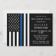 Convide seus convidados de estilo para a festa de aposentadoria de um policial com este cartão de convite elegante. Este design apresenta uma fina linha azul de bandeira americana sobre fundo preto. À direita estão todos os detalhes do seu partido para você personalizar. Na parte traseira do cartão está preto com uma linha azul de estanho no centro, onde se lê "Celebrando 35 Anos de Serviço" (o número de anos pode ser personalizado).