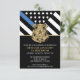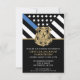 Este design apresenta uma bandeira da polícia com listras pretas e brancas, e uma fina faixa azul de linha também. O crachá da polícia e o texto do ouro estão acima de todos os detalhes do partido para os detalhes do polícia aposentado, xerife, capitão ou chefe do partido aposentado.