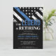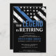 Este design apresenta uma bandeira da polícia com listras pretas e brancas, e uma fina faixa azul de linha também. O texto "A lenda está se aposentando" se senta acima de todos os detalhes partidários para os detalhes do polícia aposentado, xerife, capitão ou chefe do partido aposentado.