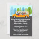 Venha celebrar a última parada do motorista de ônibus e chute sua aposentadoria! Este design branco bonito apresenta um ônibus escolar amarelo com corujas. Árvores verdes e azuis alinham o fundo. Personalize este convite para a festa de aposentadoria de um motorista de ônibus. Há também muito espaço no verso para mais informações, fotos, uma breve descrição de seus anos de serviço dedicado e comprometido. Este convite também funciona bem para uma aposentadoria de professores, ou para o aniversário de uma criança com um tema de ônibus.