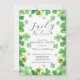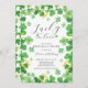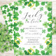 Convite moderno e divertido para a festa de Rehearsal Lucky in Love Irlandesa com um belo quadro de trevo de quatro folhas com ferraduras douradas.