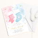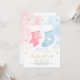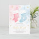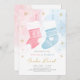 Um feriado de Natal intitulado Baby Gender Reveal Convite de festas. O design de inverno apresenta meias festivas, azuis e cor-de-rosa, bonitinhas, sobre neve azul e rosa e fundo de flocos de neve com estrelas douradas. O elegante texto da tipografia dourada diz "Revolução de gênero".