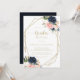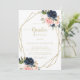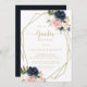 Este convite de festas geométrico de ouro floral revela que é perfeito para um gênero rústico de bebês. O design apresenta belas flores azuis escuras pintadas manualmente, azuis, marinhos, cor-de-rosa, pinceladas, douradas e folhagem verde, enfeitando um quadro geométrico.