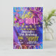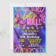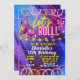 Vamos Roll Convite de aniversário com luzes néon vívidas em azul, rosa e roxo, e texto em cor-de-rosa, branco e amarelo, excelente para festas de aniversário de disco de patinagem em rolo para meninas.