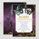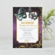 Convide seus convidados para uma glamourosa festa de mascarada de Halloween com este convite maravilhoso. Apresentando máscaras assustadoras, um fundo de enfumaçado roxo e espirais de brilho dourado, ele define o tom perfeito para um evento divertido e misterioso.