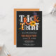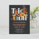 O design bonito apresenta uma ilustração de truque ou trapaça de aranha branca, monstro, chapéu de bruxa, morcego e rede. Personalize com seus detalhes de festa de aniversário de Halloween em letras laranja e brancas em fundo de quadro.