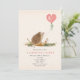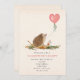 Um convite de festa de São Valentim com uma ilustração de cogumelos com balão em forma de coração rosa e ouriço.