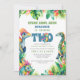 Segundo aniversário de dinossauro convite tropical para o bebê fazer dois anos. Mergulhe em uma comemoração do ROAR com este encantador convite de aniversário do Dinossauro, com adoráveis dinossauros aquosos e folhas tropicais vibrantes. Perfeitamente projetado para o seu segundo aniversário.