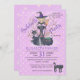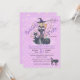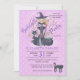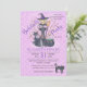 Engraçado chic lilac-roxo do Halloween bolinhas de tipografia festa de solteira de convite apresentando uma bruxa em uma cinza vestindo um chapéu com vassoura, pá-escova, pote reprodutora e gatos pretos Encha em suas informações nos pontos, Você pode escolher personalizá-lo mudando mais as fontes e as cores das letras. — O convite é adequado para uma divertida festa noturna das bruxas perversas do Halloween. — Se precisar de assistência para personalizá-la, por favor, entre em contato comigo!