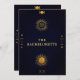 Um modelo de convite para festas de solteira moderno, elegante e chic com um tema de tarô, vidente, com elementos azul escuro, índio e tarô: sol, lua, cálice etc. e uma camada de ouro (é um efeito digital, não uma folha real). Uma design de solteira de tarô divertida para uma noiva moderna. Uma escolha encantadora para uma festa divertida de leitura de palma, contar a fortuna, olhar para o horóscopo e outras atividades divertidas e místicas com as meninas, antes do grande dia.