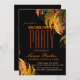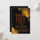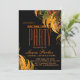 Este é um cartão de convite floral vermelho alaranjado para festas de solteira de casamento com uma aparência elegante na superfície preta com fonte antiga de cor verde-do-mar.