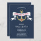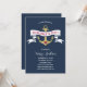 Este glam, "Última vela antes do véu", convite para festa de solteira tema náutico apresenta uma âncora falsa de ouro, uma faixa de vintagem rustica azul e branca, um coração vermelho giro e um fundo azul marinho.