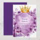 Este belo modelo de convite para casamento apresenta uma coroa ouro real adornada com joias ametistas, aninhada sobre um escudo heráldico embrulhado em ouro. Ao redor do design são lavandas exuberantes e peônias violetas, criando um luxuoso e vintage motif floral. Perfeito para casamentos românticos, reais ou celebrações elegantes com um toque de nobreza e encanto floral. A blindagem de vazio oferece espaço para nomes, datas ou mensagens personalizados.