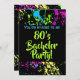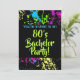 Tenha uma divertida festa de solteiro com tema dos anos 80 ou uma noite de rapazes antes do casamento! Design moderno e descolado com respingos de tinta em cores vibrantes, roxo, verde, azul e amarelo contra um fundo preto de alto contraste. Ótimo para uma festa com tema retrô dos anos 80. Arte de expressionismo abstrato em uma paleta de cores super brilhantes. Personalize com seu nome ou texto!