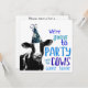 Uma vaca preta e branca, usando um chapéu de festa, informando que pretende festejar até que as vacas voltem para casa! Este é o convite perfeito para qualquer encontro no campo.